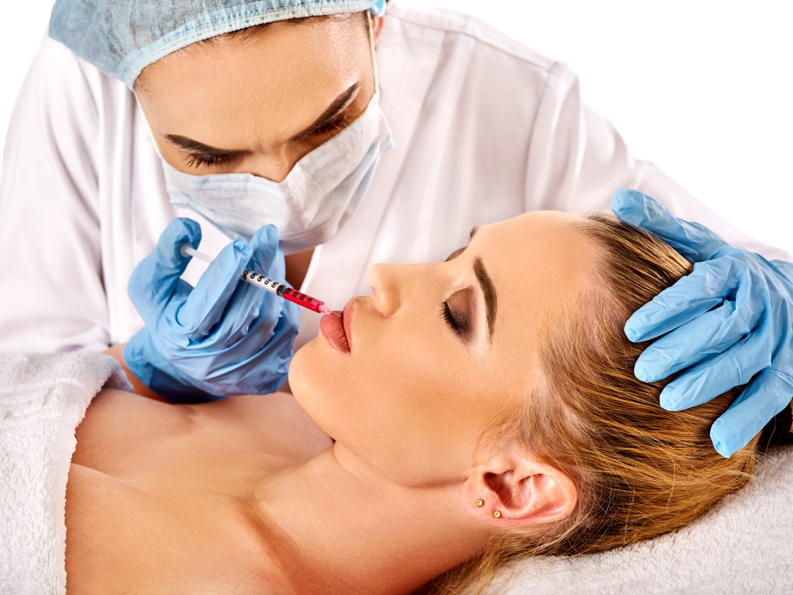 Top 7 Summer Plastic Surgery Procedures | Dr. Michelle PlaceFiller injection for female forehead face. Plastic aesthetic facial surgery in beauty clinic. Beauty woman giving injections. Doctor with red syringe injects cheeks drug. The best spa clinic in world.
